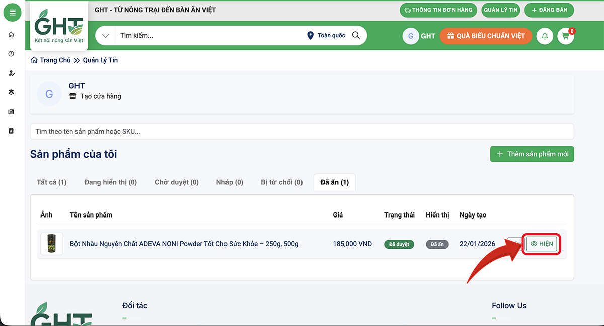 Bước 2: Ở mục tin Đã ẩn, chọn mục Tin đã ẩn rồi lựa chọn tin đăng đã ẩn cần hiện lại và chọn nút Hiện tin: